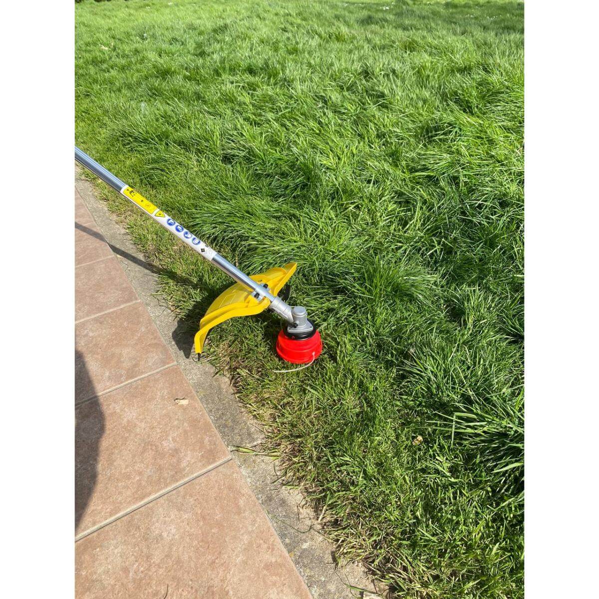 - La débroussailleuse est équipée avec une tête de coupe double fil et du système performant « Tap and go » qui vous permet de dérouler le fil de la bobine simplement en appuyant sur la tête. Pas besoin d’outils ni de connaissances techniques.