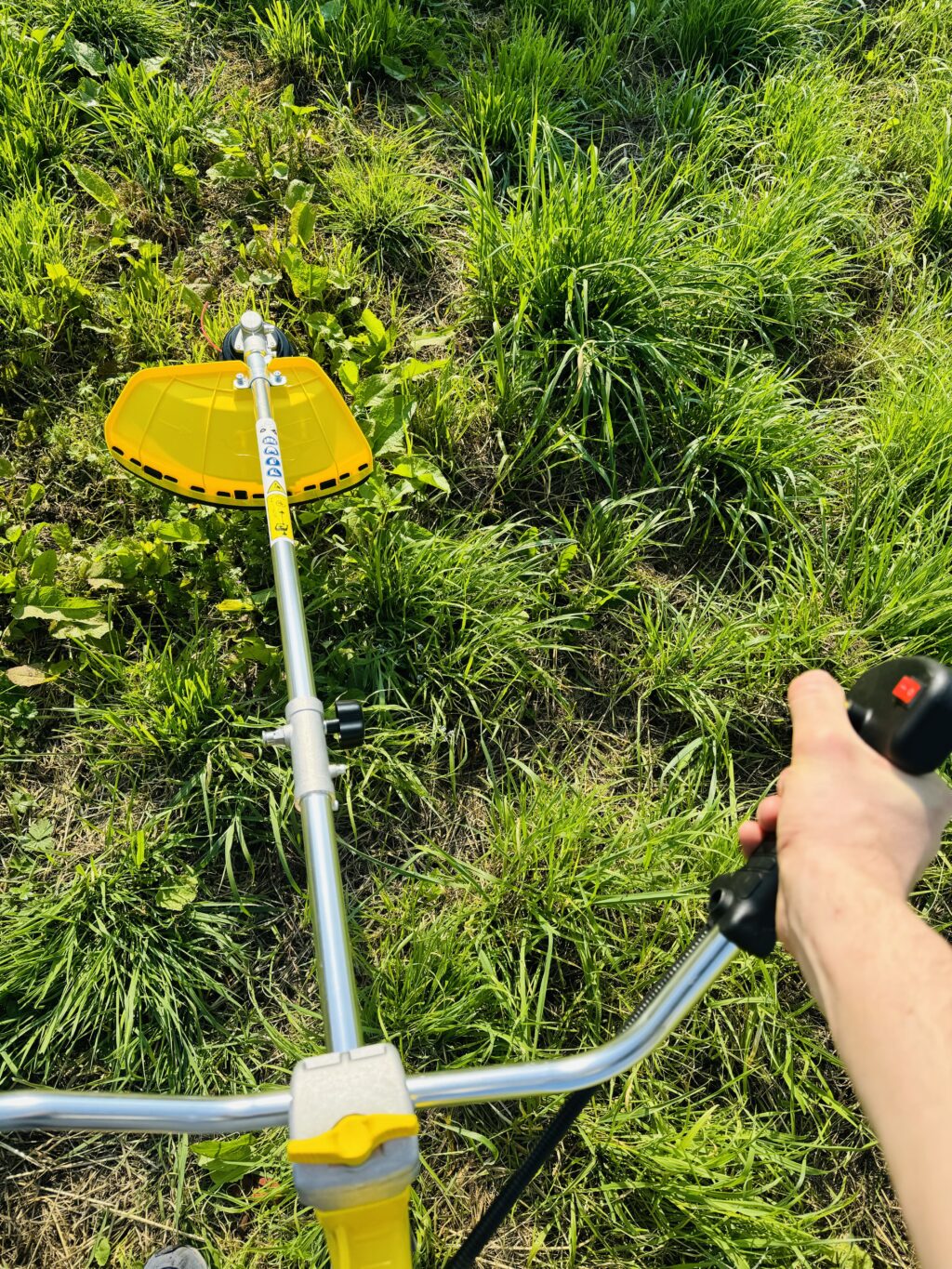 - La débroussailleuse est équipée avec une tête de coupe double fil et du système performant « Tap and go » qui vous permet de dérouler le fil de la bobine simplement en appuyant sur la tête. Pas besoin d’outils ni de connaissances techniques.