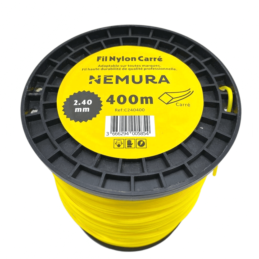 Bobine fil nylon carré – Longueur: 400m, Ø: 2,40mmFabriqué avec des matières vierges. Fil haute durabilité.Excellente tenue à l’oeillet.Fil pour toutes marques de débroussailleuses, Stihl, Husqvarna, Partner, Oleo Mac, Dolmar, Echo, Mc Culloch, Jonsered, Partner, MTD…N’hésitez pas à nous contacter pour plus de renseignements.